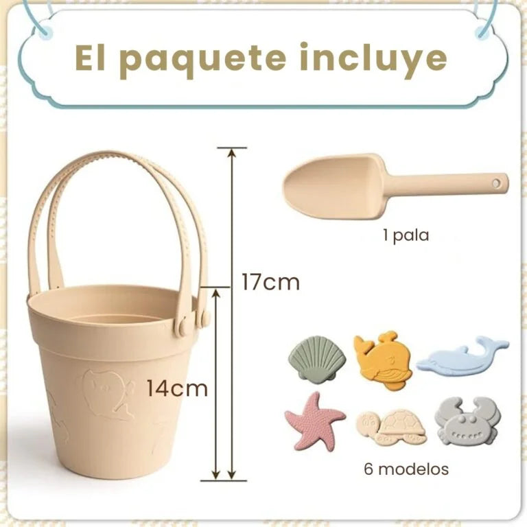 Entretén a tus hijos durante horas en la playa con nuestro juego de juguetes de playa de silicona, ideal para niños pequeños y mayores. Este completo set incluye un cubo de arena de silicona con capacidad de 1.5 litros, una pala resistente, y cuatro moldes de arena suaves que permitirán a tus pequeños crear formas y castillos tanto en la playa como en la caja de arena en casa.