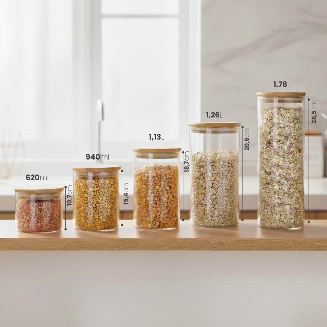 Fabricados en vidrio de borosilicato, estos frascos son resistentes, ligeros y compatibles con alimentos secos y líquidos. Las tapas de bambú natural aportan un toque decorativo y aseguran un sellado confiable para conservar la frescura por más tiempo.