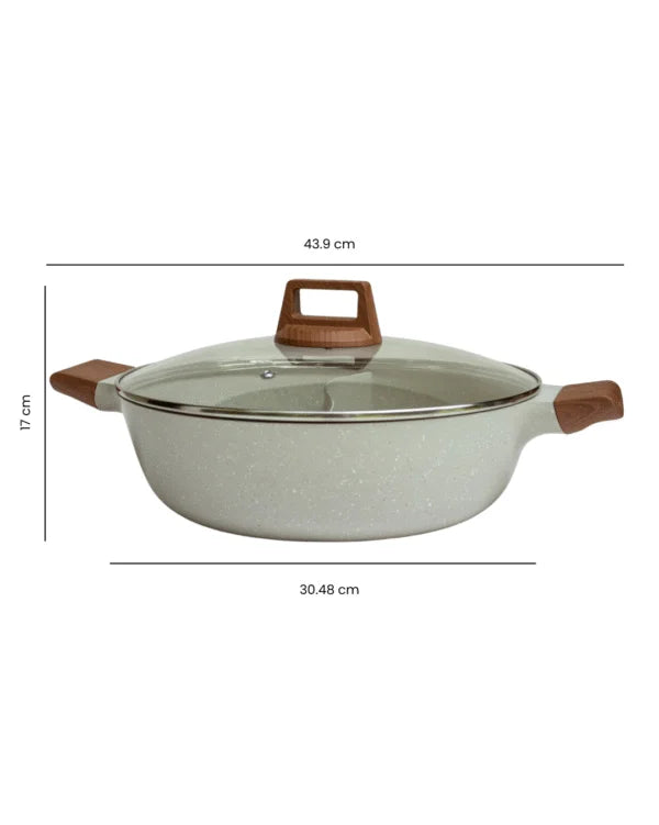 Ideal para 3 a 6 personas, sucuerpo de aleación de aluminio con recubrimiento antiadherentedistribuye el calor de manera uniforme, evitando que los alimentos se peguen y facilitando la limpieza. Además, suacabado texturizado y mangos con efecto maderaaportan un toque cálido, minimalista y elegante inspirado en el estilo japandí.